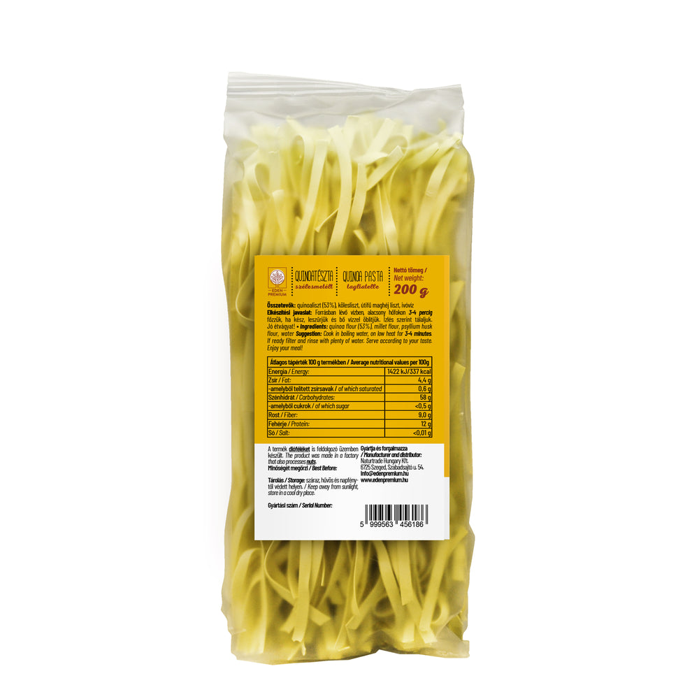 Quinoalisztből készült gluténmentes szélesmetélt száraztészta kölesliszttel.