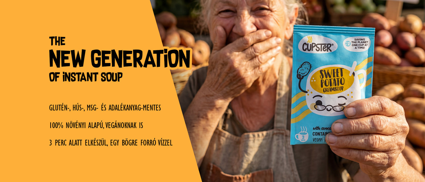 A Cupster instant vegán krémleves gluténmentes tésztával és batátával készül, a bársonyos érzetért! Ez a termék mindig kéznél van (egy tenyérnyi csomagolásban!), amikor egy gyors falatra van szükséged, de nem szeretnél lemondani a speciális étrendedről, vagy tisztább alternatívát keresel. Próbáld ki az instant levesek új generációját!
