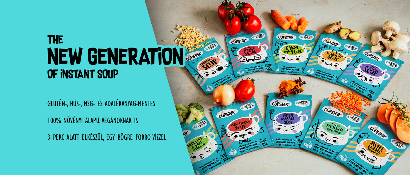 A Cupster átfogó Taste pakkja instant vegán zöldséglevesekből, gluténmentes tésztával! Ezek a termékek mindig kéznél vannak (egy tenyérnyi csomagolásban!), amikor egy gyors falatra van szükséged, de nem szeretnél lemondani a speciális étrendedről, vagy tisztább alternatívát keresel. Próbáld ki az instant levesek új generációját!