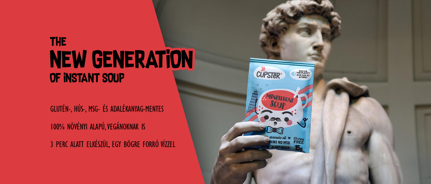 A Cupster instant vegán zöldségleves gluténmentes tésztával készül, itáliai stílusban! Ez a termék mindig kéznél van (egy tenyérnyi csomagolásban!), amikor egy gyors falatra van szükséged, de nem szeretnél lemondani a speciális étrendedről, vagy tisztább alternatívát keresel. Próbáld ki az instant levesek új generációját!