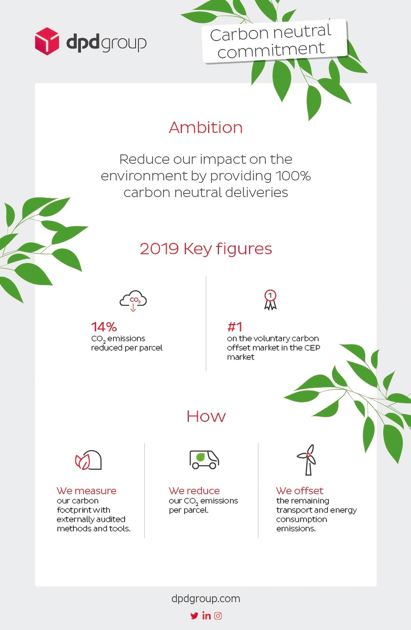 A fenntarthatóság melletti elköteleződés eredményeként a DPD Hungary is csatlakozott ahhoz a nemzetközi tervhez, amely lehetővé teszi, hogy a fenntartható szállítás nemzetközi referenciájává váljunk. Stratégiánk célja a károsanyag kibocsátás csökkentése a teljes csomagszállítási lánc folyamán. 2025-ig 83%-kal kevesebb üvegházhatású gázt fogunk kibocsátani, DPDgroup szinten pedig 15 000 alternatív meghajtású gépjárművel fogjuk a csomagokat kézbesíteni. A fennmaradó szén-dioxid kibocsátást tiszta energiával kapcsolatos projektekkel egyensúlyozzuk. Ezeket a megújuló energiás beruházásokat nemzetközi szinten koordináljuk. Indiában szélturbinák telepítésének köszönhetően a helyi lakosság számára biztosítható energiaellátás a teljes évre, valamint Brazíliában biogáz turbinák működtetéséhez járulunk hozzá.